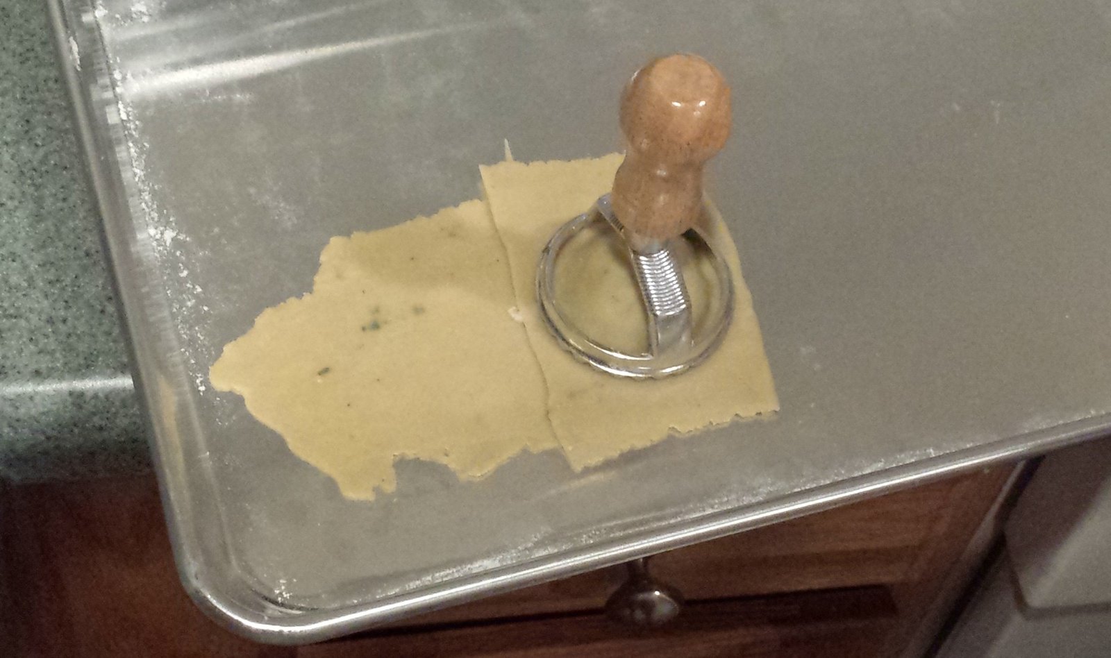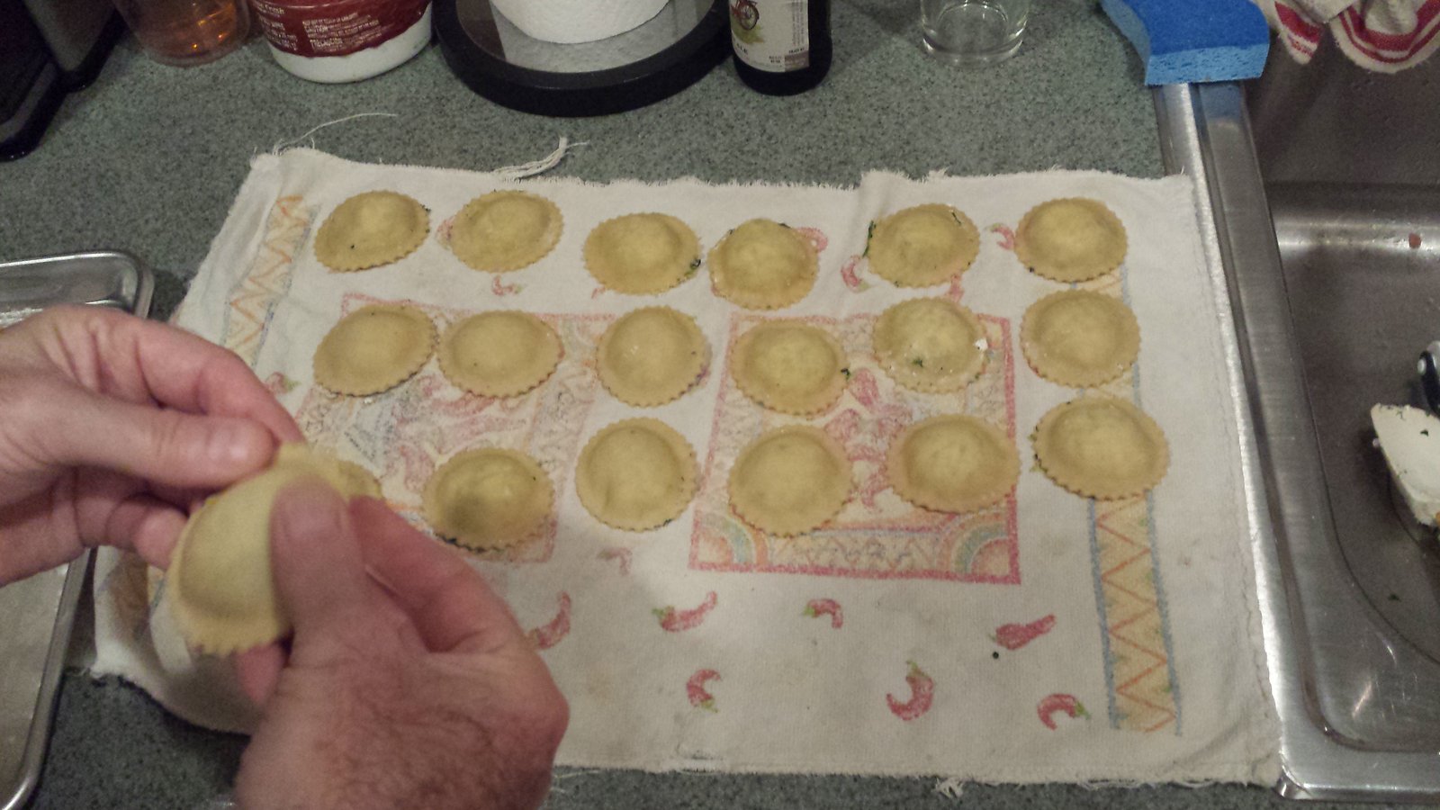 Put the sheet of dough on a lightly floured work surface, We used a cookie sheet. The long side should be nearest you. Most recipes have you put the filling into rounded teaspoon sized mounds down the center of one-half of the sheet. My new ravioli stamp was too large for this so we had to make them one at a time by putting a mound of filling on the pasta about 4 inches from the end and folding the end over the mound and then using the stamp to cut the pasta. This took forever but they did look good. As we cut away the excess pasta we started combining it to create a new ball of pasta that we used to roll out a new sheet. If you don’t have a stamp, just put your mounds about 1 1/2 inches apart down the center of one-half of the sheet. Then fold the sheet down the middle over the mounds of filling. Press down firmly but gently to remove the air. Any air pockets will increase the chance that the ravioli will break during cooking. Cut the pasta between the mounds into squares. You can use a fork to seal the edges (and it makes it look good). As you make them, place the cut ravioli onto a lightly floured kitchen towel. We intentionally let ours sit for about 20 minutes to sort of start drying and it seems to help because we didn’t have a single ravioli break during cooking.