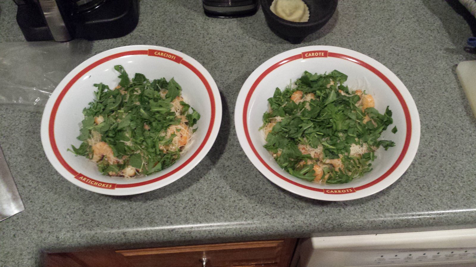 Once the ravioli are cooked and the shrimp has been sauteed in the sauce, divide them among your plates then cover with the sauce and add the arugula over the pasta. You can get enough for 5 or 6 people, depending on how many ravioli you want to put on each plate. It was just the two of us so we put about 7 into one bowl and 7 into another bowl. This was our main course and we served it with a salad on the side.