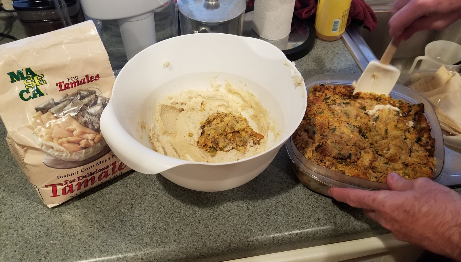 - Make the Masa Dough:In a large bowl, mix the masa, 1 cup stock, lard, baking powder, and salt until it forms a grainy, spreadable paste. Once this is mixed well, add the cornbread stuffing and mix well. Add the additional stock a little at a time until the dough returns to a soft, spreadable texture.