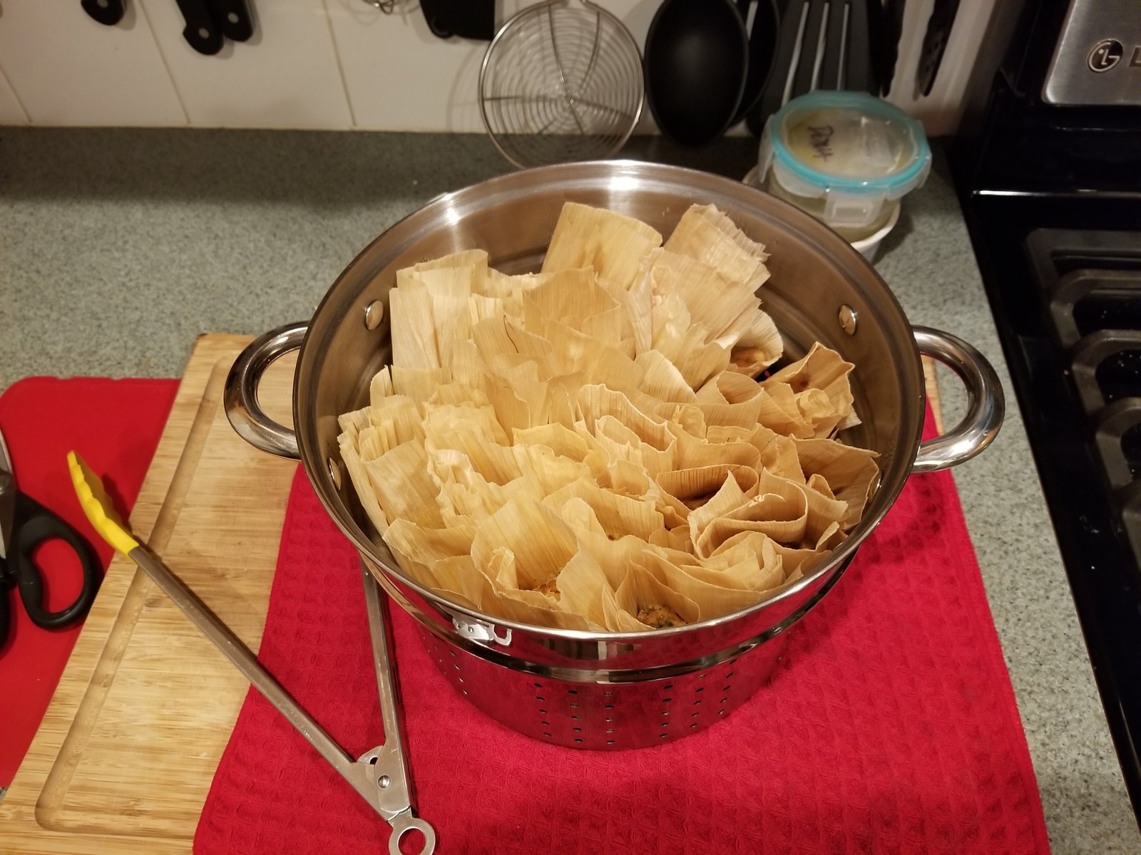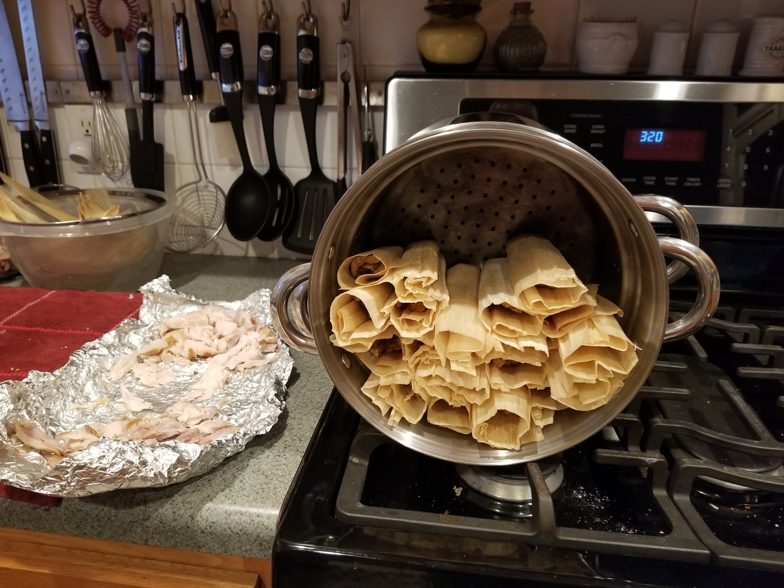 Once you’ve filled the husks with the dough and turkey, steam them over water for 2 hours. Check the water level regularly and replenish as needed. One tip is to put a penny in the bottom of the pan (in the water). If you hear the penny start to rattle, it’s time to add water.