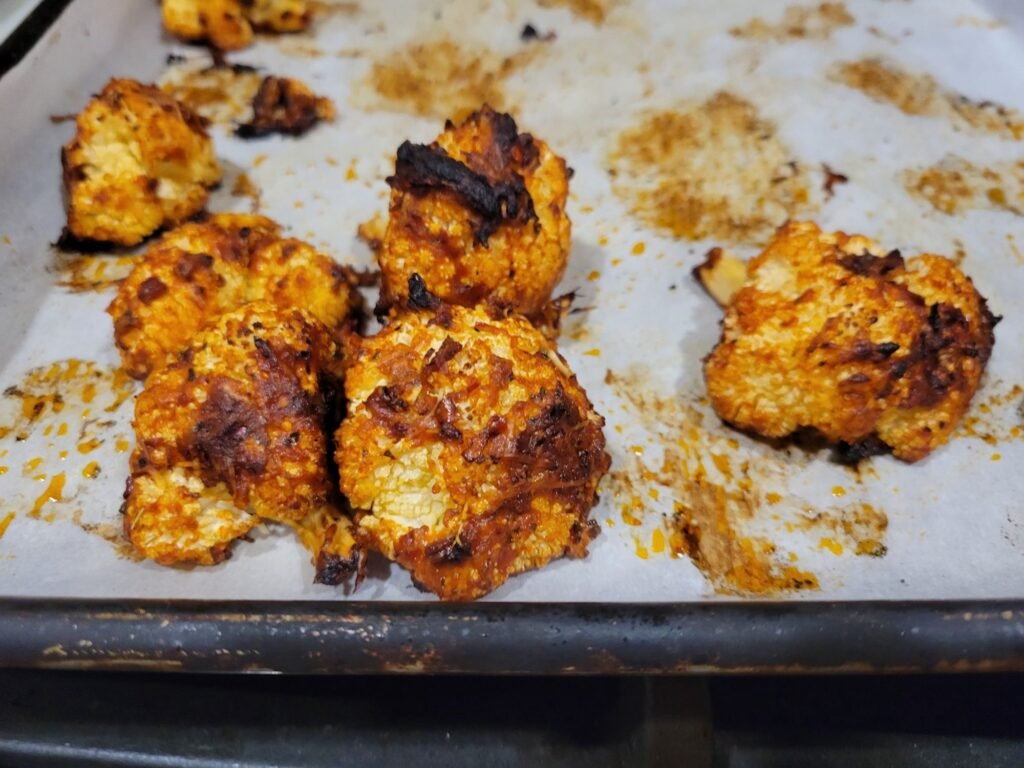 - Using the spatula to transfer the cauliflower florets and all the sauce to a large baking sheet. Spread out the florets to give them a little space between them and, as best you can, try to turn them so the cut side is down.