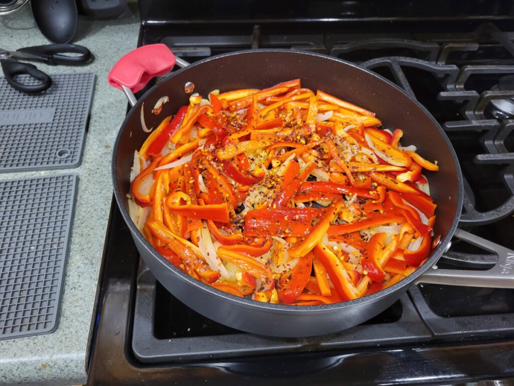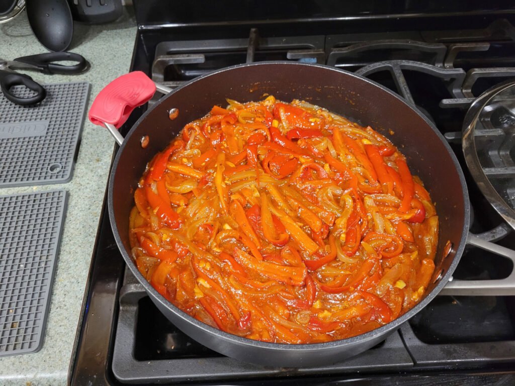 Red Pepper Flakes – we didn’t see any recipes calling for these, but we add them to almost everything so we used a tablespoon. The heat is a nice compliment to the sweet peppers, so it works really well. It’s not traditional based on the recipes we found, but go for it-you won’t be sorry.