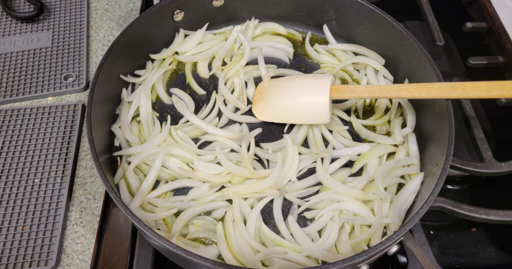 - Use a skillet or frying pan and heat over medium low heat. Add the olive oil and onions.